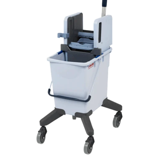 Το καρότσι με μονό κουβά 25L από την επαγγελματική σειρά της Vileda (Professional) αποτελείται από πρέσα σφουγγαρίστρας κι ενσωματωμένες ρόδες για εύκολη μεταφορά. Έχει ανθεκτική και εργονομική κατασκευή με μεγαλύτερο ύψος για αποφυγή σκυψίματος κατά το στύψιμο κι εύκολη, ξεκούραστη χρήση. Είναι κατάλληλο για κάθετο σφουγγάρισμα με επαγγελματική σφουγγαρίστρα.